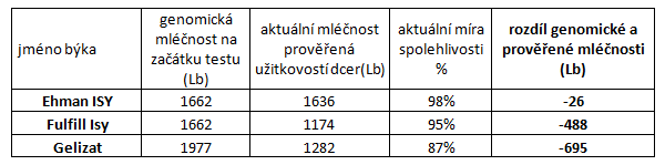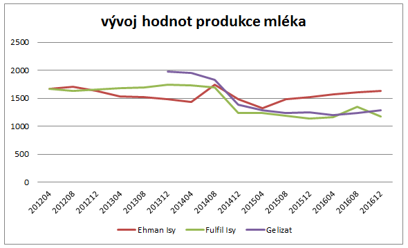 V grafu je znázorněn vývoj hodnot produkce mléka v librách dle USA stupnice NM od dubna 2012 u býků Ehman a Fulfil Isy. U býka Gelizat jsou hodnoty datovány od prosince 2013. Další faktorem je, že v prosinci 2014 došlo v USA ke změně báze, proto v dubnu 2015 již jsou hodnoty přepočítávány na jiný průměr produkce mléka v USA.